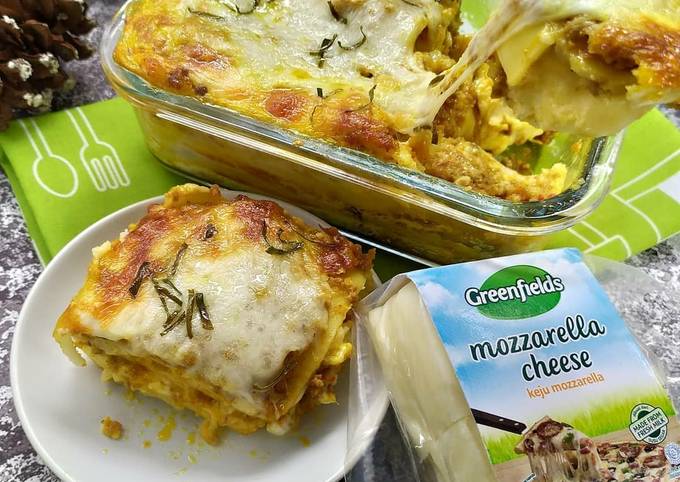 Tuangkan sisa saus keju. 3 lembar lasagna instan direbus matang 1 butir telur kocok lepas Keju mozzarella Keju cheddar parut Bahan Saus Bechamel. 250 gr daging sapi cincang 200 ml santan.