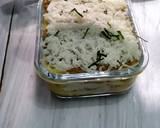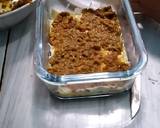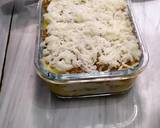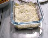 3 lembar lasagna instan direbus matang. Ulangi proses ini sampai semua lembaran lasagna. Taburi dengan keju cheddar parut dan tuang sedikit telur kocok.